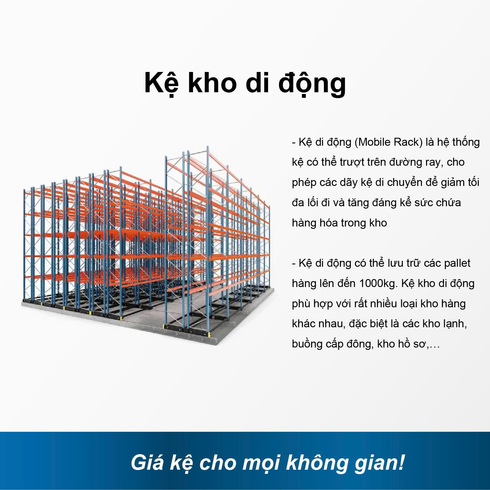 - Kệ di động (Mobile Rack) là hệ thống kệ có thể trượt trên đường ray, cho phép các dãy kệ di chuyển để giảm tối đa lối đi và tăng đáng kể sức chứa hàng hóa trong kho